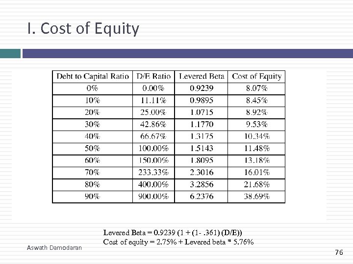 I. Cost of Equity Aswath Damodaran Levered Beta = 0. 9239 (1 + (1 -. 361) (D/E)) Cost of equity = 2. 75% + Levered beta * 5. 76% 76