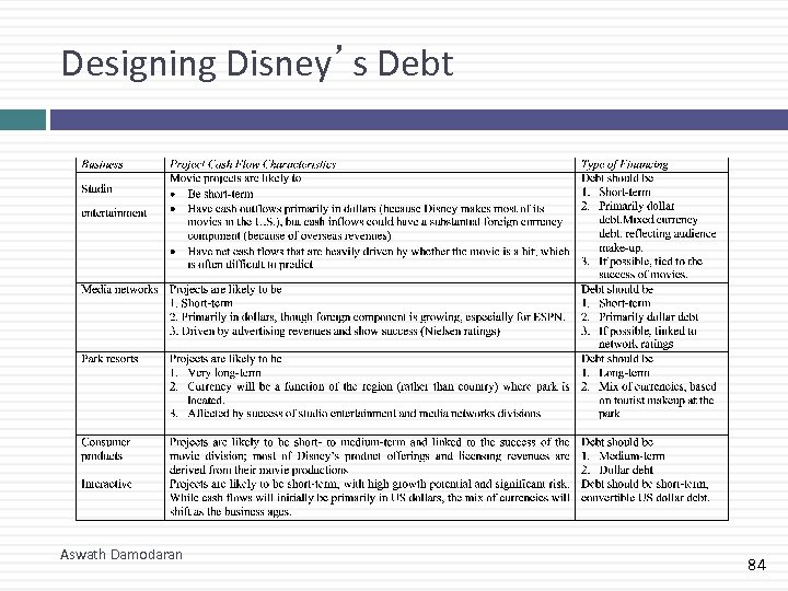 Designing Debt: The Fundamental Principle The objective in designing debt is to make the cash flows on debt match up as closely as possible with the cash flows that the firm makes on its assets. By doing so, we reduce our risk of default, increase debt capacity and increase firm value. Unmatched Debt Aswath Damodaran Matched Debt 83