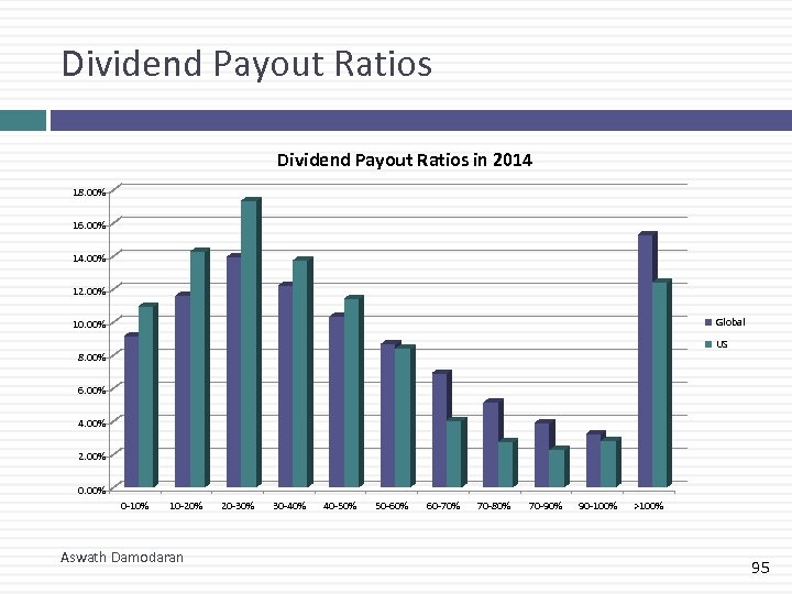 Dividend Payout Ratios in 2014 18. 00% 16. 00% 14. 00% 12. 00% Global 10. 00% US 8. 00% 6. 00% 4. 00% 2. 00% 0 -10% 10 -20% Aswath Damodaran 20 -30% 30 -40% 40 -50% 50 -60% 60 -70% 70 -80% 70 -90% 90 -100% >100% 95