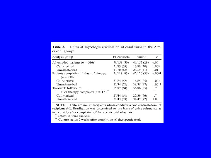 What about Candiduria? • 10% of positive urine cultures in referral hospitals yield candida sp. • Symptomatic candiduria should be treated • What about catheter associated candiduria? – Short term eradication with 14 days fluconazole – No effect on candiduria two weeks after therapy – No effect on mortality Sobel. Clin Inf Dis 2000; 30: 19