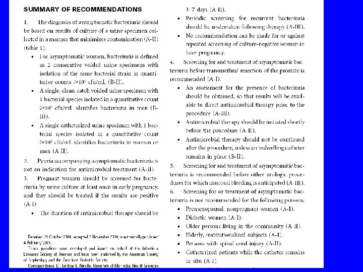 Nicolle et al IDSA Guidelines for Asymptomatic Bacteriuria. Clin Inf Dis 2005; 40: 643 -54