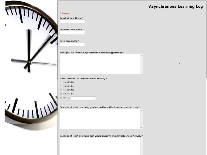 Logging • UT Southwestern – Residents log their Asynchronous Learning time as a procedure in the residency management suite • UT Houston – Began program logging on paper – Transitioned to online log with “evaluation component” – Using Google. Docs, data automatically entered into spreadsheet for review