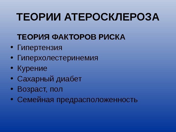 ТЕОРИИ АТЕРОСКЛЕРОЗА ТЕОРИЯ ФАКТОРОВ РИСКА • Гипертензия • Гиперхолестеринемия • Курение • Сахарный диабет • Возраст, пол • Семейная предрасположенность