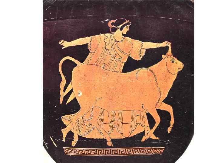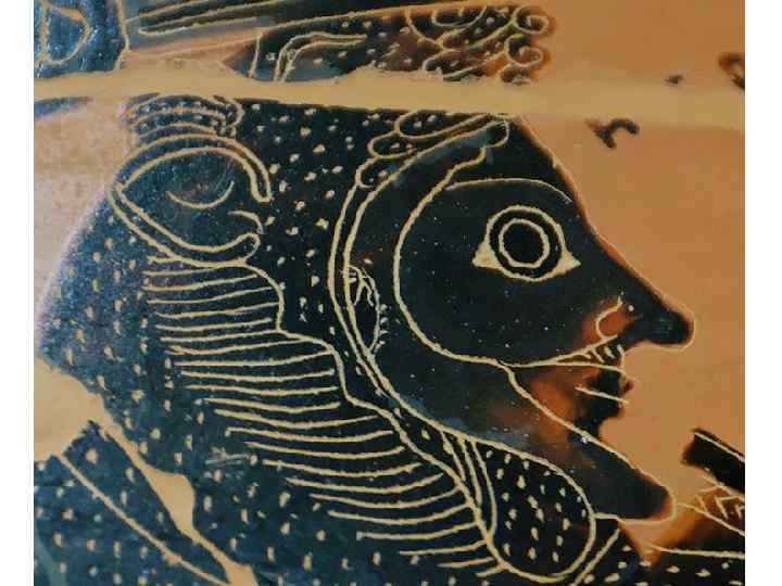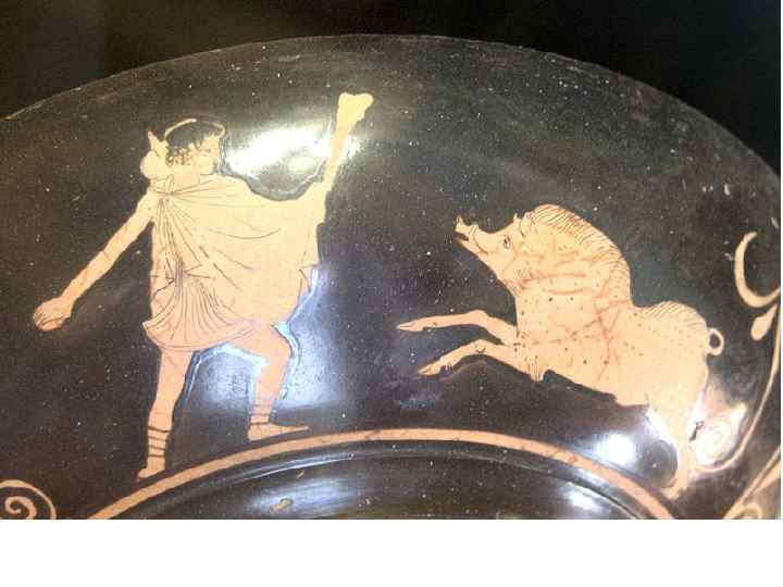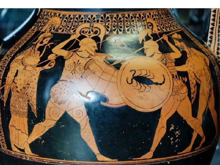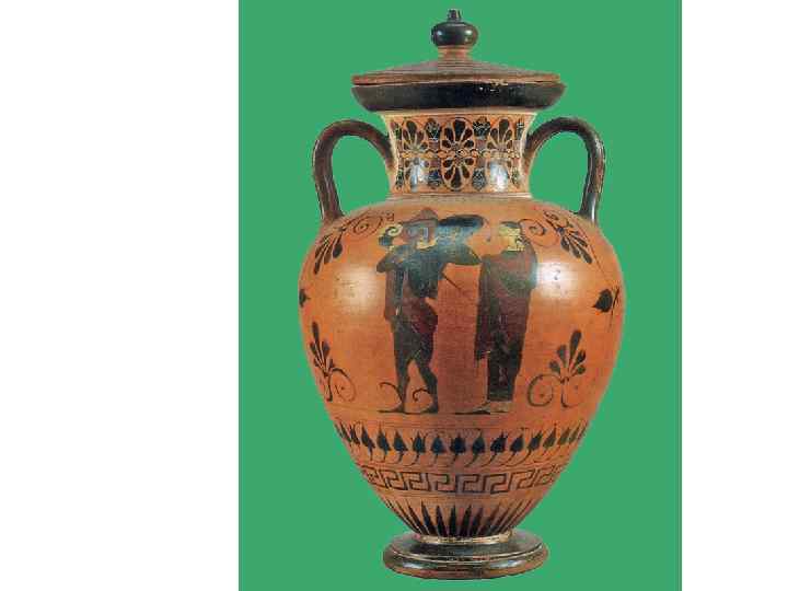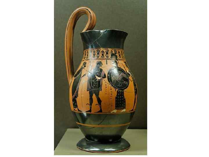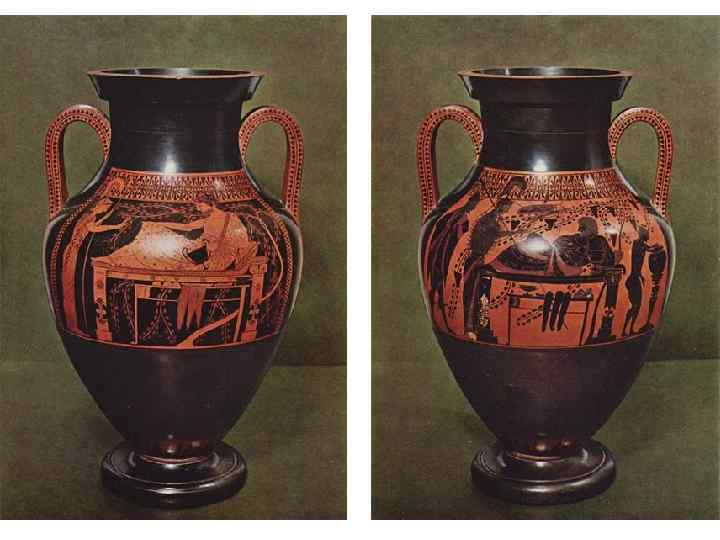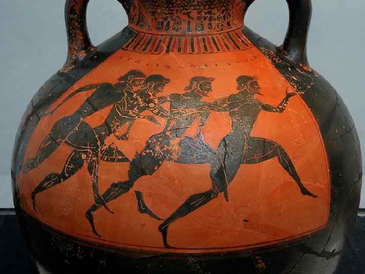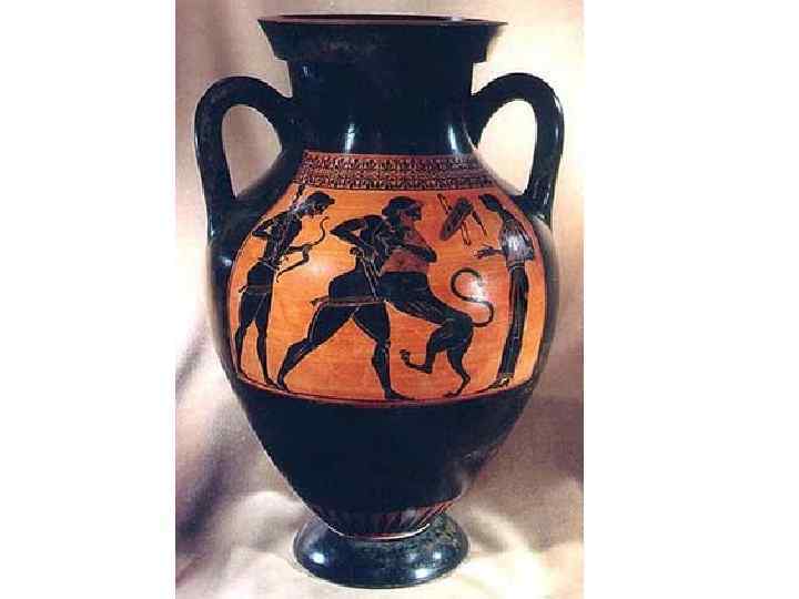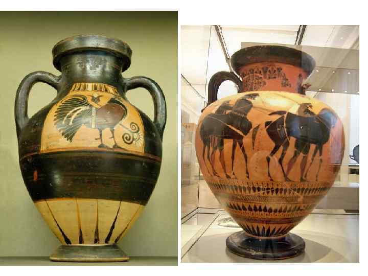 Эта роспись на вазе выполнена в чёрнофигурном стиле (чёрные фигуры на красном фоне)