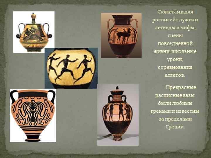 Древние греки расписывали любые виды глиняной посуды, использовавшиеся для хранения, приёма пищи, в обрядах и праздниках. Особо тщательно оформленные произведения керамики приносили в дар храмам или вкладывали в захоронения.