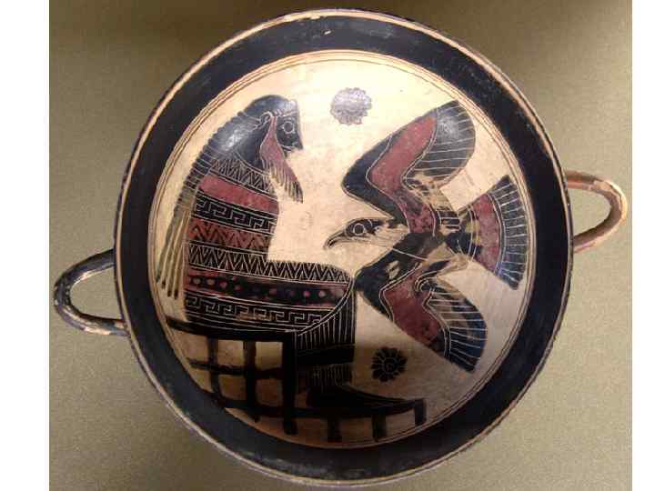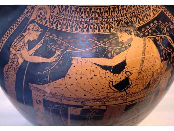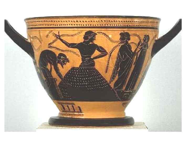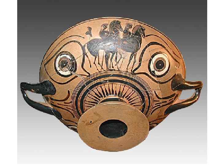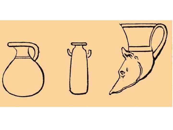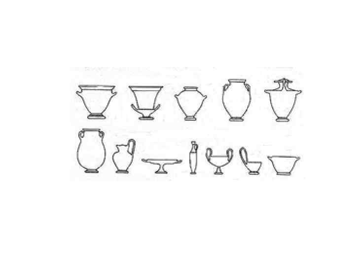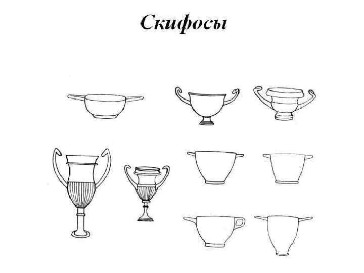 сосуды: 1. 2. 3. 4. 5. 6. 7. 8. 9. канфар – чаша для вина. ойнохоя – кувшин для воды или вина. кратер – сосуд для смешивания вина с водой. гидрия – сосуд для воды. лекиф – сосуд для масла, благовоний, ритуальный сосуд. скифос – большая чаша для вина. Греки пили вино, разбавляя его водой, пить неразбавленное вино считалось дурным тоном и называлось «пить по-скифски» . киаф –черпак для разбавленного вина. килик – самая распространённая чаша для вина пелика – сосуд для хранения.