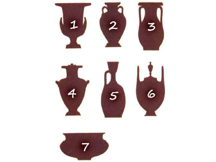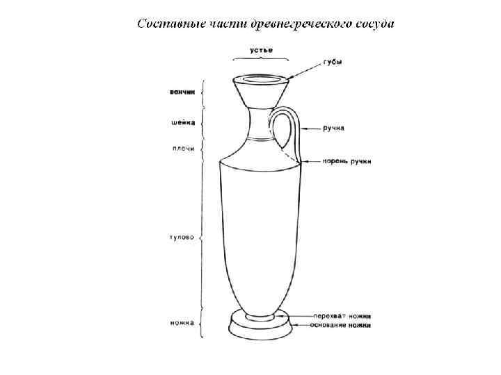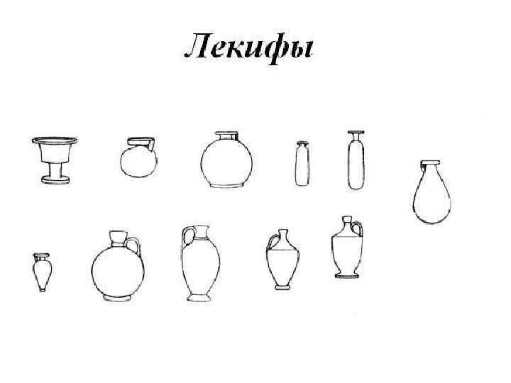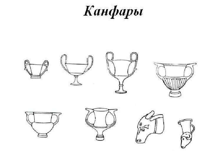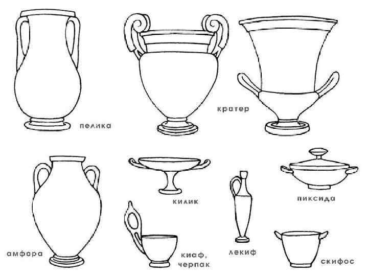 Древнегреческие сосуды: 1 - стамнос, 2 - пелика, 3 - амфора, 4 - псиктер, 5 - кратер, 6 - ойнохоя, 7 - гидрия, 8 - киаф, 9 - арибалл, 10 - алабастр, 11 - ритон, 12 - скифос, 13 - килик, 14 - канфар, 15 - лутрофор, 16 - лекиф, 17 - пиксида, 18 - аскос.
