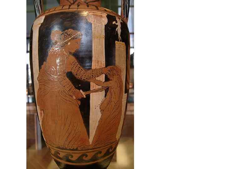 Данная ваза расписана в краснофигурном стиле (красные фигуры на чёрном фоне)