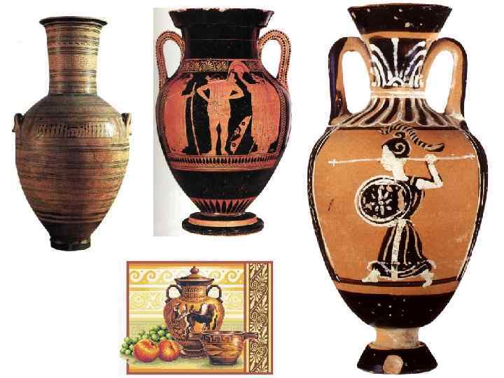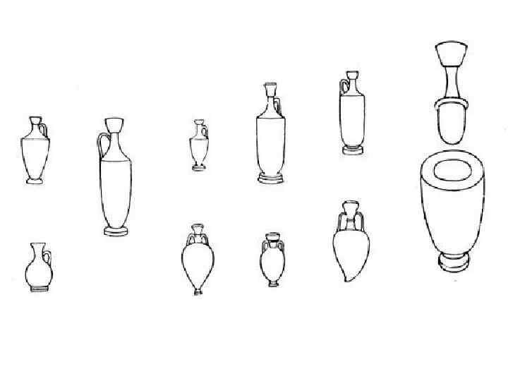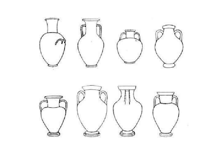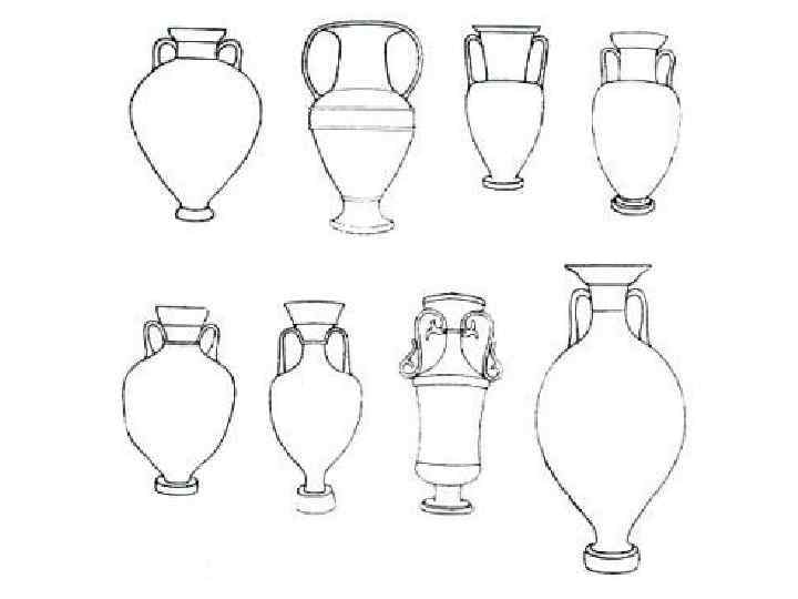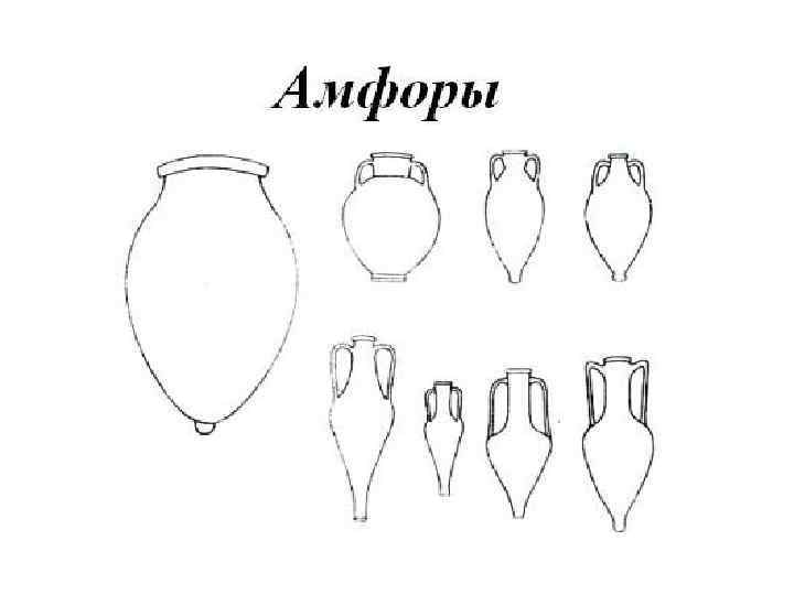 Амфора – длинный сосуд, с узким горлышком и ручками с двух сторон – для хранения вина и масла, транспортировке на кораблях. Амфоры дарили победителям на олимпийских играх, использовались в погребальных целях. овальный сосуд с двумя ручками