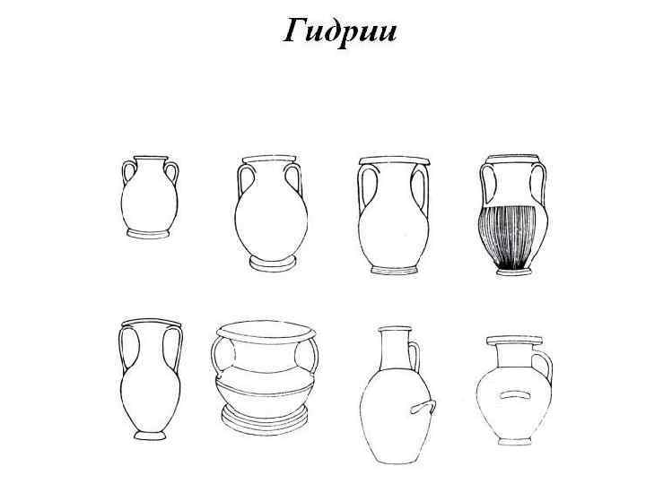 Гидрия – сосуд разнообразный по формам и величине с массивной ручкой, круглым туловом и длинным горлышком, на конце которого чашеобразное окончание или несколько желобков для слива. Гидрия использовалась для переноса и хранения воды, а также для разлива воды.