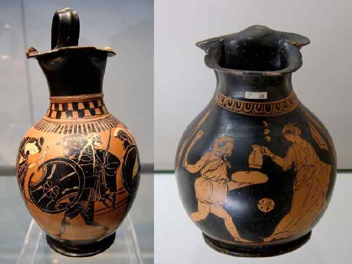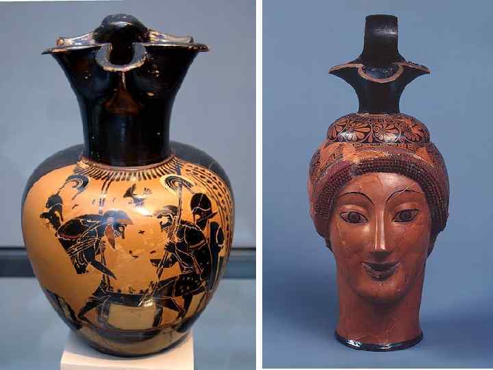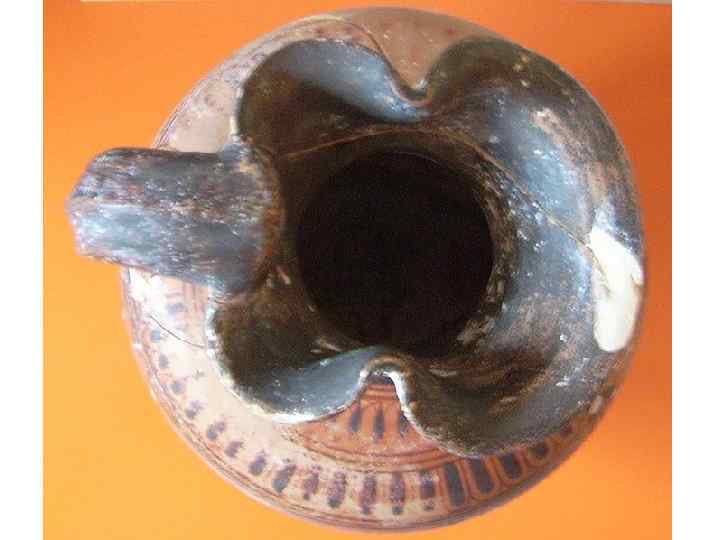Потом из кратера переливали в третий сосуд - "ойнохойю" - кувшин с тремя носиками - это чтобы сразу наливать одновременно в три чаши. Посмотрите на ойнохойю. Обратите внимание на три носика