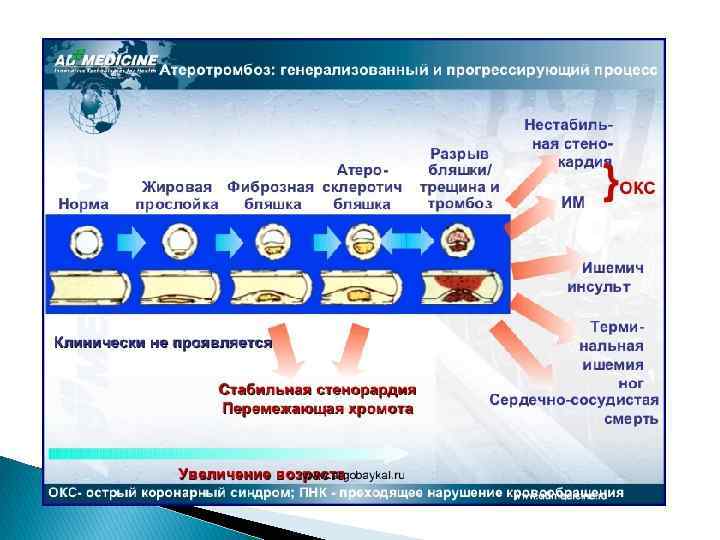 Основные патогенетические механизмы обострения атеросклероза ослабление фиброзной оболочки бляшки и её разрыв; непропорционально большое липидное ядро; тромбообразование в месте разрыва капсулы бляшки или на дефекте эндотелия при выраженном стенозе; дисфункция эндотелия (локальная и генерализованная); диффузная воспалительная реакция.