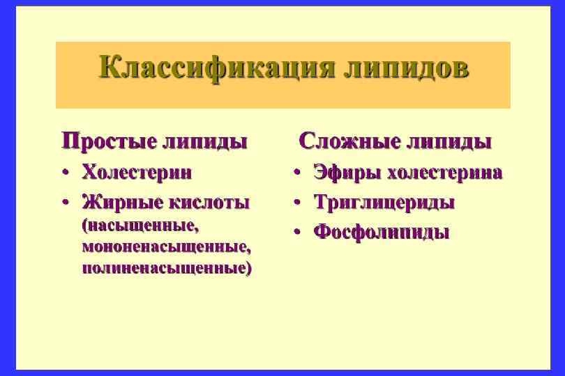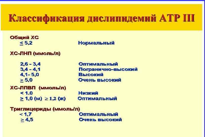 Оптимальные уровни липидов (в стандартных единицах измерения) 1) общий холестерин 2) индекс атерогенности 3) липопротеиды низкой плотности 4) Триглицериды 5) Липопротеиды высокой плотности В ммоль/л <5 <4 <3 <2 >1
