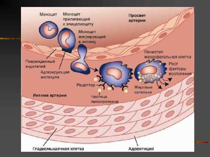 Модифицированные ЛПНП n n Вызывают повреждение сосудистого эндотелия. Окисленные ЛПНП захватываются макрофагами, которые при этом трансформируются в пенистые клетки, входящие в состав атеросклеротических бляшек