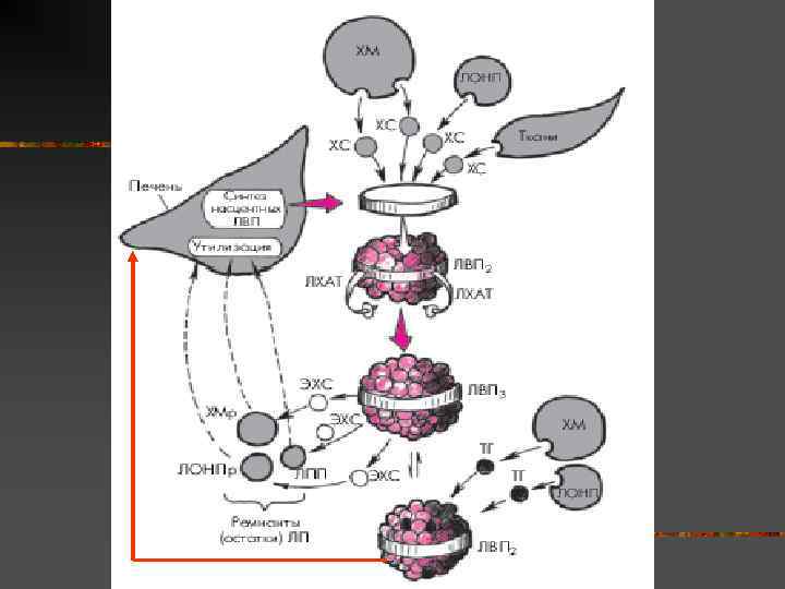 Метаболизм ХМ, ЛПОНП печень Кишечник кровь ХМ ЛПОНП АПР-С Печеночная липаза Энергетический субстрат для эндотелий Миокард, скелетная мускулатура. Остатки ХМ, ЛПОНП превращаются в ЛППП и ЛПНП