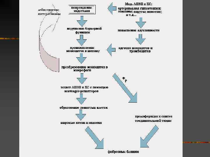 Патогенез n В настоящее время принята гипотеза, что основа заболевания - окислительная модификация липопротеинов и накопление их в стенке сосудов с развитием воспалительного ответа на повреждение эндотелия.