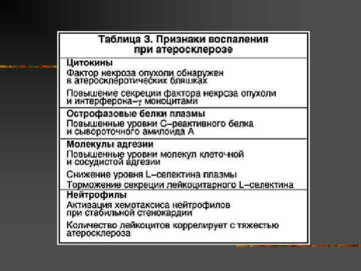 Атеросклероз – хроническое воспаление n Клеточный состав бляшек оказался подобным составу хронического воспаления, протекающего в интиме артерий. В настоящее время атеросклеротическое поражение рассматривают как полиэтиологическую реакцию сосудистой стенки подобную воспалению, которая появляется в раннем детском возрасте.