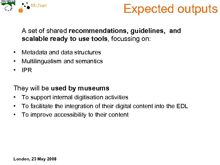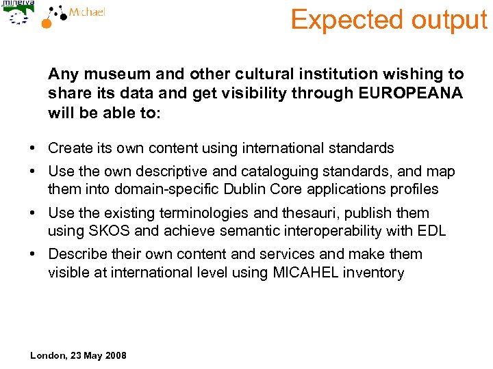 Expected output Any museum and other cultural institution wishing to share its data and get visibility through EUROPEANA will be able to: • Create its own content using international standards • Use the own descriptive and cataloguing standards, and map them into domain-specific Dublin Core applications profiles • Use the existing terminologies and thesauri, publish them using SKOS and achieve semantic interoperability with EDL • Describe their own content and services and make them visible at international level using MICAHEL inventory London, 23 May 2008