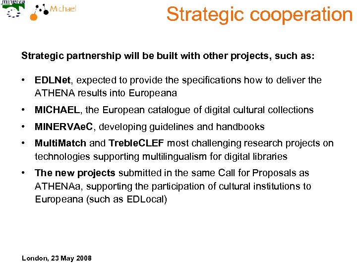 Strategic cooperation Strategic partnership will be built with other projects, such as: • EDLNet, expected to provide the specifications how to deliver the ATHENA results into Europeana • MICHAEL, the European catalogue of digital cultural collections • MINERVAe. C, developing guidelines and handbooks • Multi. Match and Treble. CLEF most challenging research projects on technologies supporting multilingualism for digital libraries • The new projects submitted in the same Call for Proposals as ATHENAa, supporting the participation of cultural institutions to Europeana (such as EDLocal) London, 23 May 2008