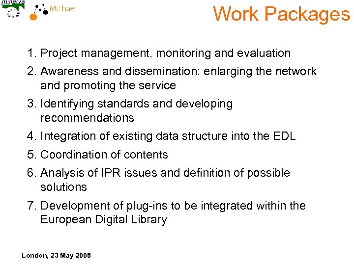 Work Packages 1. Project management, monitoring and evaluation 2. Awareness and dissemination: enlarging the network and promoting the service 3. Identifying standards and developing recommendations 4. Integration of existing data structure into the EDL 5. Coordination of contents 6. Analysis of IPR issues and definition of possible solutions 7. Development of plug-ins to be integrated within the European Digital Library London, 23 May 2008