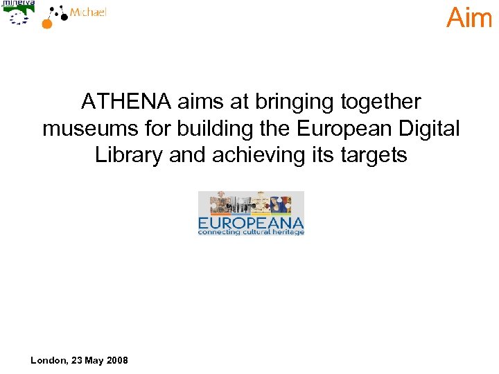 Aim ATHENA aims at bringing together museums for building the European Digital Library and achieving its targets London, 23 May 2008