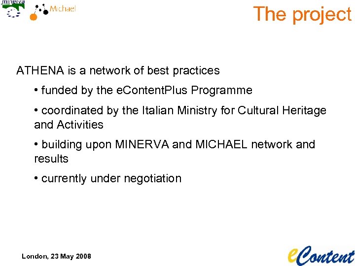 The project ATHENA is a network of best practices • funded by the e. Content. Plus Programme • coordinated by the Italian Ministry for Cultural Heritage and Activities • building upon MINERVA and MICHAEL network and results • currently under negotiation London, 23 May 2008