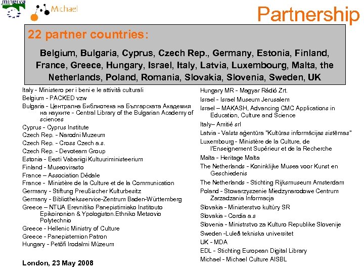 Partnership 22 partner countries: Belgium, Bulgaria, Cyprus, Czech Rep. , Germany, Estonia, Finland, France, Greece, Hungary, Israel, Italy, Latvia, Luxembourg, Malta, the Netherlands, Poland, Romania, Slovakia, Slovenia, Sweden, UK Italy - Ministero per i beni e le attività culturali Belgium - PACKED vzw Bulgaria - Централна Библиотека на Българската Академия на науките - Central Library of the Bulgarian Academy of sciences Cyprus - Cyprus Institute Czech Rep. - Narodni Muzeum Czech Rep. - Cross Czech a. s. Czech Rep. - Devoteam Group Estonia - Eesti Vabariigi Kultuuriministeerium Finland - Museovirasto France – Association Dédale France - Ministère de la Culture et de la Communication Germany - Stiftung Preußischer Kulturbesitz Germany - Bibliotheksservice-Zentrum Baden-Württemberg Greece – NTUA Erevnitiko Panepistimiako Institouto Epikoinonion & Ypologiston. Ethniko Metsovio Polytechnio Greece - Hellenic Ministry of Culture Greece - Panepistemion Patron Hungary - Petőfi Irodalmi Múzeum London, 23 May 2008 Hungary MR - Magyar Rádió Zrt. Israel - Israel Museum Jerusalem Israel – MAKASH, Advancing CMC Applications in Education, Culture and Science Italy– Amitié srl Latvia - Valsts aģentūra "Kultūras informācijas sistēmas" Luxembourg - Ministère de la Culture, de l'Enseignement Supérieur et de la Recherche Malta - Heritage Malta The Netherlands - Koninklijke Musea voor Kunst en Geschiedenis The Netherlands - Stichting Rijksmuseum Amsterdam Poland - Stowarzyszenie Miedzynarodowe Centrum Zarzadzania Informacja Slovakia - Ministerstvo kultúry SR Slovakia - Cordia a. s Slovenia - Ministrstvo za Kulturo Republike Slovenije Sweden -Luleå tekniska universitet UK - MDA EDL - Stichting European Digital Library Michael - Michael Culture AISBL