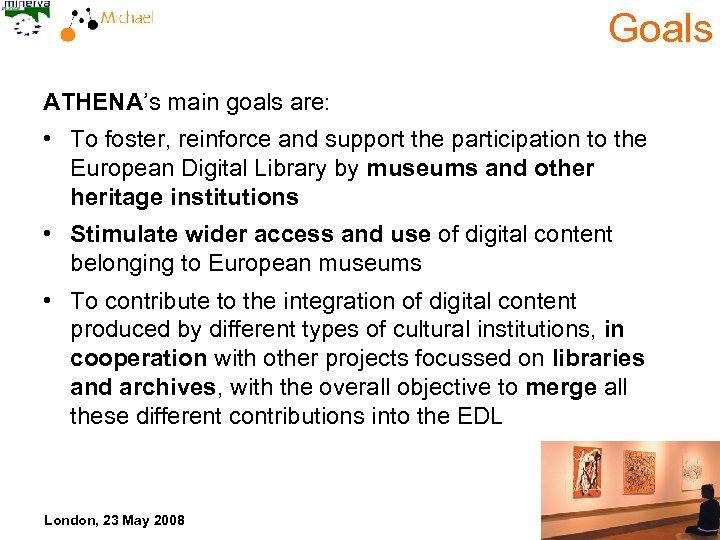 Goals ATHENA’s main goals are: • To foster, reinforce and support the participation to the European Digital Library by museums and other heritage institutions • Stimulate wider access and use of digital content belonging to European museums • To contribute to the integration of digital content produced by different types of cultural institutions, in cooperation with other projects focussed on libraries and archives, with the overall objective to merge all these different contributions into the EDL London, 23 May 2008