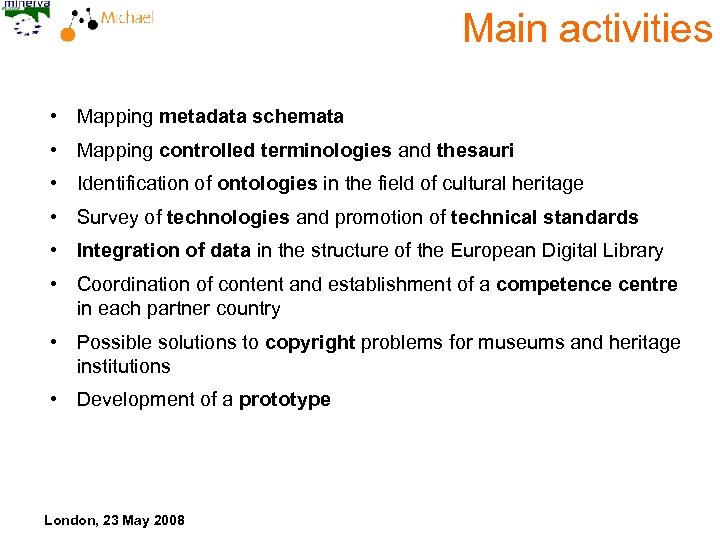 Main activities • Mapping metadata schemata • Mapping controlled terminologies and thesauri • Identification of ontologies in the field of cultural heritage • Survey of technologies and promotion of technical standards • Integration of data in the structure of the European Digital Library • Coordination of content and establishment of a competence centre in each partner country • Possible solutions to copyright problems for museums and heritage institutions • Development of a prototype London, 23 May 2008
