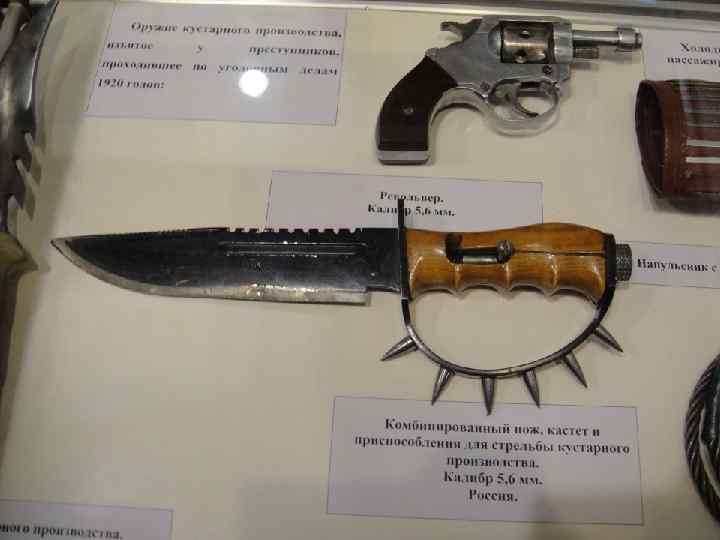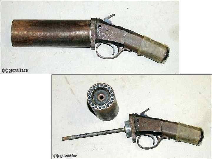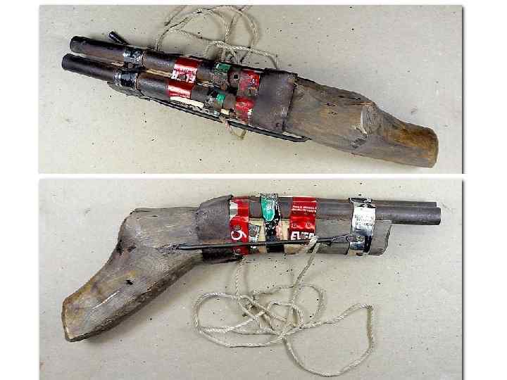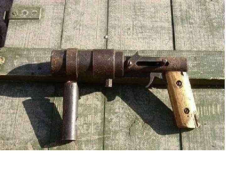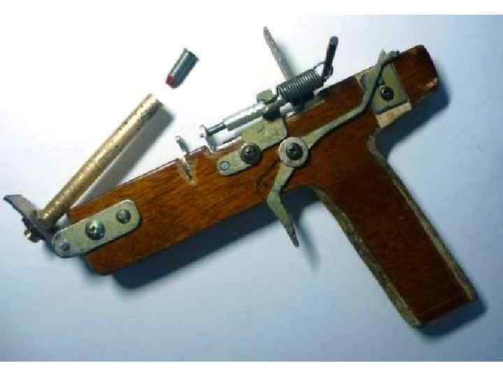 Самодельное огнестрельное оружие • Самодельные конструкции варьируют от самых примитивных, повторяющих первые фитильные дульнозарядные пистолеты, до достаточно совершенных или даже несущих новые, нигде не использованные технические решения. В ряде стран, например в Китае, где достать фабричное оружие практически невозможно, производство кустарного оружия принимает большой размах. • Обычно такое оружие бывает довольно низкого качества, отличается неточностью стрельбы; пуля отличается нестабильностью траектории, но это же обстоятельство, помимо уменьшения меткости, может приводить к усилению останавливающего действия пули.