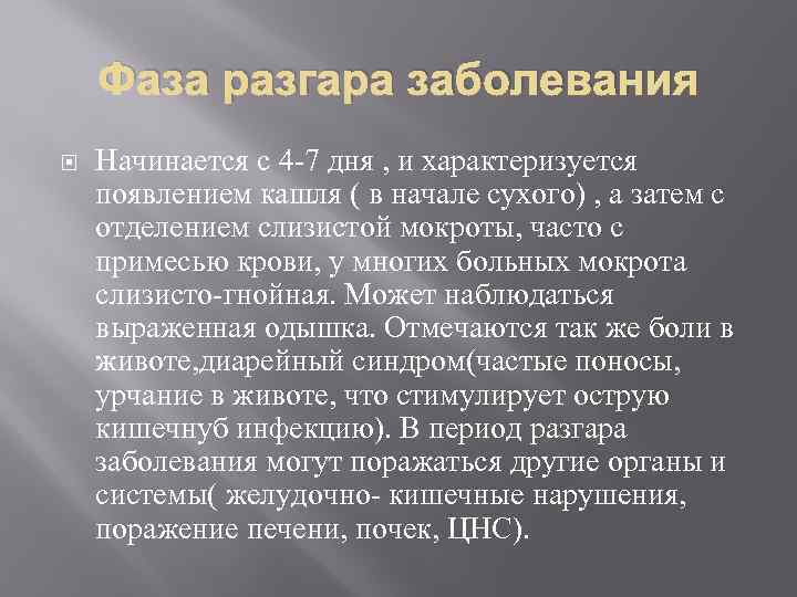 Фаза разгара заболевания Начинается с 4 -7 дня , и характеризуется появлением кашля ( в начале сухого) , а затем с отделением слизистой мокроты, часто с примесью крови, у многих больных мокрота слизисто-гнойная. Может наблюдаться выраженная одышка. Отмечаются так же боли в животе, диарейный синдром(частые поносы, урчание в животе, что стимулирует острую кишечнуб инфекцию). В период разгара заболевания могут поражаться другие органы и системы( желудочно- кишечные нарушения, поражение печени, почек, ЦНС).