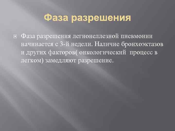 Фаза разрешения легионеллезной пневмонии начинается с 3 -й недели. Наличие бронхоэктазов и других факторов( онкологический процесс в легком) замедляют разрешение.