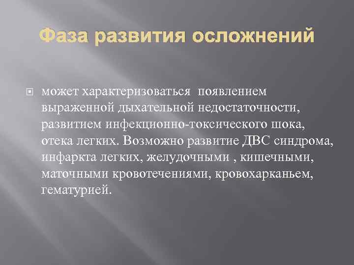 Фаза развития осложнений может характеризоваться появлением выраженной дыхательной недостаточности, развитием инфекционно-токсического шока, отека легких. Возможно развитие ДВС синдрома, инфаркта легких, желудочными , кишечными, маточными кровотечениями, кровохарканьем, гематурией.