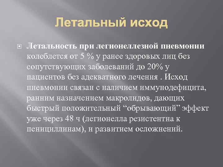 Летальный исход Летальность при легионеллезной пневмонии колеблется от 5 % у ранее здоровых лиц без сопутствующих заболеваний до 20% у пациентов без адекватного лечения. Исход пневмонии связан с наличием иммунодефицита, ранним назначением макролидов, дающих быстрый положительный “обрывающий” эффект уже через 48 ч (легионелла резистентна к пенициллинам), и развитием осложнений.