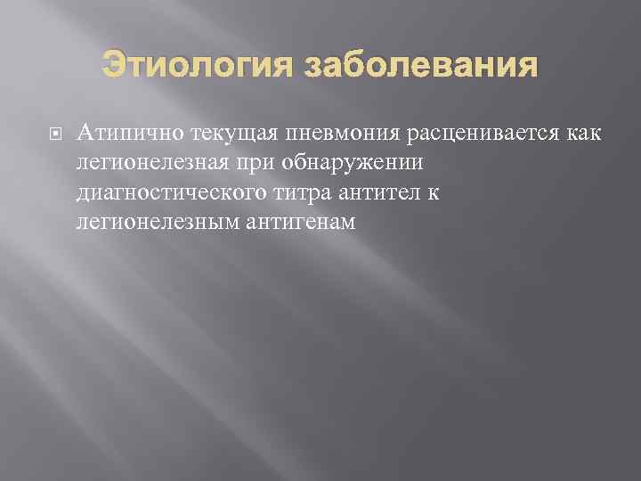 Этиология заболевания Атипично текущая пневмония расценивается как легионелезная при обнаружении диагностического титра антител к легионелезным антигенам
