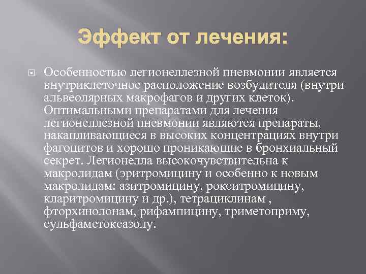 Эффект от лечения: Особенностью легионеллезной пневмонии является внутриклеточное расположение возбудителя (внутри альвеолярных макрофагов и других клеток). Оптимальными препаратами для лечения легионеллезной пневмонии являются препараты, накапливающиеся в высоких концентрациях внутри фагоцитов и хорошо проникающие в бронхиальный секрет. Легионелла высокочувствительна к макролидам (эритромицину и особенно к новым макролидам: азитромицину, рокситромицину, кларитромицину и др. ), тетрациклинам , фторхинолонам, рифампицину, триметоприму, сульфаметоксазолу.