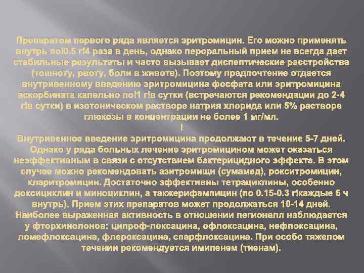 Препаратом первого ряда является эритромицин. Его можно применять внутрь по 0. 5 г 4 раза в день, однако пероральный прием не всегда дает стабильные результаты и часто вызывает диспептические расстройства (тошноту, рвоту, боли в животе). Поэтому предпочтение отдается внутривенному введению эритромицина фосфата или эритромицина аскорбината капельно по 1 г в сутки (встречаются рекомендации до 2 -4 г в сутки) в изотоническом растворе натрия хлорида или 5% растворе глюкозы в концентрации не более 1 мг/мл. Внутривенное введение эритромицина продолжают в течение 5 -7 дней. Однако у ряда больных лечение эритромицином может оказаться неэффективным в связи с отсутствием бактерицидного эффекта. В этом случае можно рекомендовать азитромищн (сумамед), рокситромицин, кларитромицин. Достаточно эффективны тетрациклины, особенно доксициклин и миноциклин, а такжерифампицин (по 0. 15 -0. 3 г каждые 6 ч внутрь). Прием этих препаратов может продолжаться 10 -14 дней. Наиболее выраженная активность в отношении легионелл наблюдается у фторхинолонов: ципроф-локсацина, офлоксацина, нефлоксацина, ломефлоксацина, флероксацина, спарфлоксацина. При особо тяжелом течении рекомендуется имипенем (тиенам).