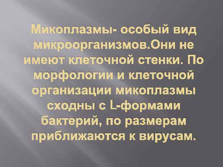 Микоплазмы- особый вид микроорганизмов. Они не имеют клеточной стенки. По морфологии и клеточной организации микоплазмы сходны с L-формами бактерий, по размерам приближаются к вирусам.