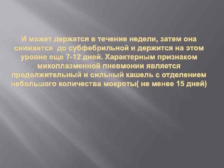 И может держатся в течение недели, затем она снижается до субфебрильной и держится на этом уровне еще 7 -12 дней. Характерным признаком микоплазменной пневмонии является продолжительный и сильный кашель с отделением небольшого количества мокроты( не менее 15 дней)