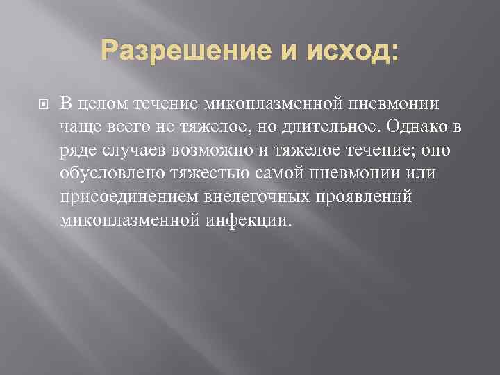 Разрешение и исход: В целом течение микоплазменной пневмонии чаще всего не тяжелое, но длительное. Однако в ряде случаев возможно и тяжелое течение; оно обусловлено тяжестью самой пневмонии или присоединением внелегочных проявлений микоплазменной инфекции.