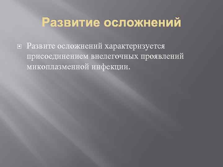 Развитие осложнений Развите осложнений характеризуется присоединением внелегочных проявлений микоплазменной инфекции.