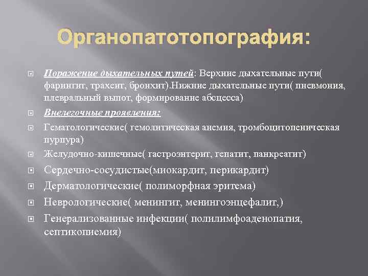 Органопатотопография: Поражение дыхательных путей: Верхние дыхательные пути( фарингит, трахеит, бронхит). Нижние дыхательные пути( пневмония, плевральный выпот, формирование абсцесса) Внелегочные проявления: Гематологические( гемолитическая анемия, тромбоцитопеническая пурпура) Желудочно-кишечные( гастроэнтерит, гепатит, панкреатит) Сердечно-сосудистые(миокардит, перикардит) Дерматологические( полиморфная эритема) Неврологические( менингит, менингоэнцефалит, ) Генерализованные инфекции( полилимфоаденопатия, септикопиемия)