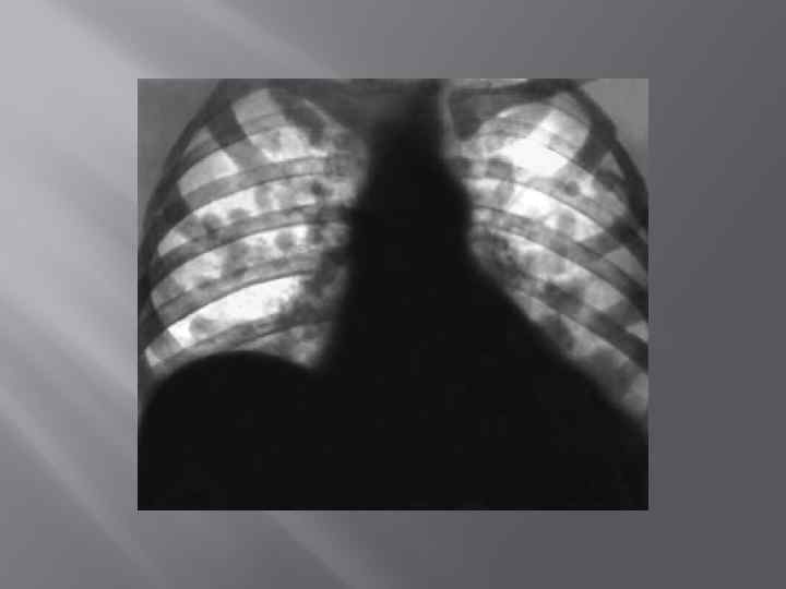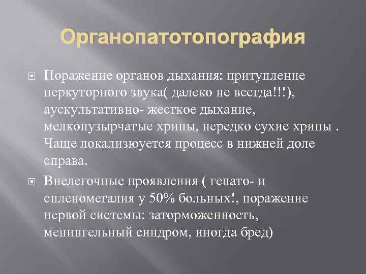 Органопатотопография Поражение органов дыхания: притупление перкуторного звука( далеко не всегда!!!), аускультативно- жесткое дыхание, мелкопузырчатые хрипы, нередко сухие хрипы. Чаще локализюуется процесс в нижней доле справа. Внелегочные проявления ( гепато- и спленомегалия у 50% больных!, поражение нервой системы: заторможенность, менингельный синдром, иногда бред)