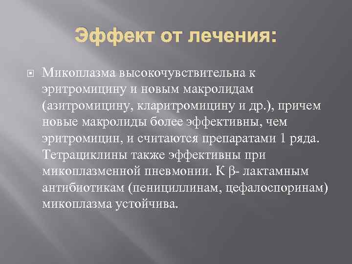 Эффект от лечения: Микоплазма высокочувствительна к эритромицину и новым макролидам (азитромицину, кларитромицину и др. ), причем новые макролиды более эффективны, чем эритромицин, и считаются препаратами 1 ряда. Тетрациклины также эффективны при микоплазменной пневмонии. К β- лактамным антибиотикам (пенициллинам, цефалоспоринам) микоплазма устойчива.