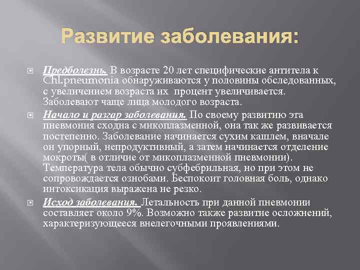 Развитие заболевания: Предболезнь. В возрасте 20 лет специфические антитела к Chl. pneumonia обнаруживаются у половины обследованных, с увеличением возраста их процент увеличивается. Заболевают чаще лица молодого возраста. Начало и разгар заболевания. По своему развитию эта пневмония сходна с микоплазменной, она так же развивается постепенно. Заболевание начинается сухим кашлем, вначале он упорный, непродуктивный, а затем начинается отделение мокроты( в отличие от микоплазменной пневмонии). Температура тела обычно субфебрильная, но при этом не сопровождается ознобами. Беспокоит головная боль, однако интоксикация выражена не резко. Исход заболевания. Летальность при данной пневмонии составляет около 9%. Возможно также развитие осложнений, характеризующееся внелегочными проявлениями.