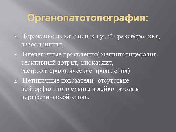 Органопатотопография: Поражение дыхательных путей трахеобронхит, назофарингит, Внелегочные проявления( менингоэнцефалит, реактивный артрит, миокардит, гастроэнтерологические проявления) Нетипичные показатели- отсутствие нейторфильного сдвига и лейкоцитоза в периферической крови.