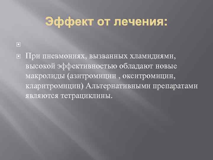 Эффект от лечения: При пневмониях, вызванных хламидиями, высокой эффективностью обладают новые макролиды (азитромицин , окситромицин, кларитромицин) Альтернативными препаратами являются тетрациклины.