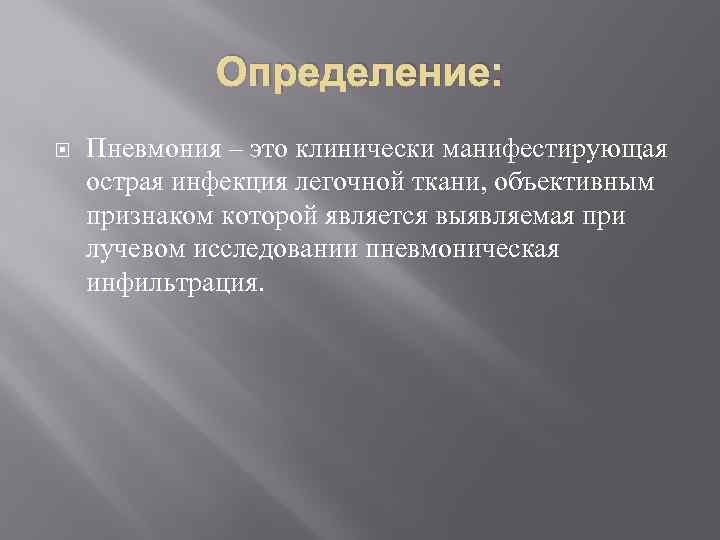 Определение: Пневмония – это клинически манифестирующая острая инфекция легочной ткани, объективным признаком которой является выявляемая при лучевом исследовании пневмоническая инфильтрация.