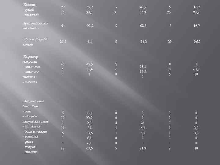 Кашель: - сухой - влажный 29 15 65, 9 34, 1 7 9 43, 7 56, 3 5 25 16, 7 83, 3 Приступообразн ый кашель 41 93, 2 9 62, 5 5 16, 7 Боли в грудной клетке 25 5 6, 8 9 56, 3 29 96, 7 20 5 0 45, 5 11, 4 0 3 6 0 18, 8 37, 5 0 0 19 6 0 63, 3 20 5 10 1 11 6 3 3 28 11, 4 22, 7 2, 3 25 13, 6 6, 8 63, 6 0 0 4 1 1 0 0 5 0 0 25 6, 3 0 0 31, 3 0 0 0 1 1 0 0 3 0 0 0 3, 3 0 0 10 Характер мокроты: - слизистая - слизистогнойная - гнойная Внелегочные симптомы: - отит - макулопапулезная сыпь - артралгия - боли в животе - тошнота - рвота - диарея - миалгия