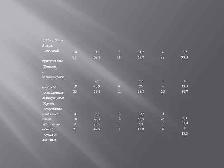 Перкуторны й звук: - легочной - притупление Дыхание: - везикулярное -жесткое -ослабленное везикулярное Хрипы: - отсутствие - влажные и/или крепитация - сухие и влажные 14 30 31, 8 68, 2 5 11 31, 2 68, 8 2 28 6, 7 93, 3 1 18 25 2, 3 40, 9 56, 8 1 4 11 6, 2 25 68, 8 0 4 26 0 13, 3 86, 7 4 10 9 21 9, 1 22, 7 20, 5 47, 7 2 10 1 3 12, 5 6, 3 18, 8 1 25 0 4 3, 3 83, 4 0 13, 3